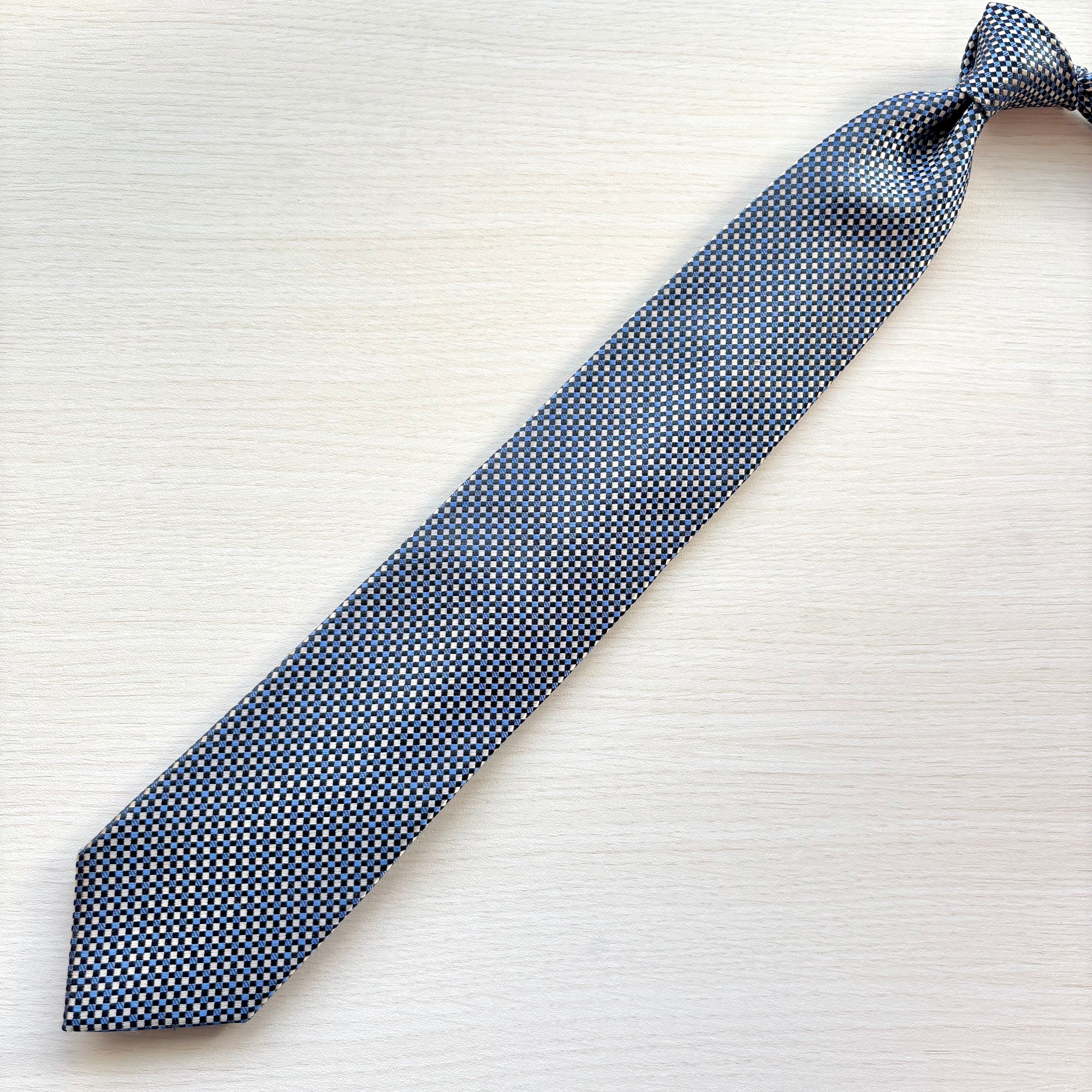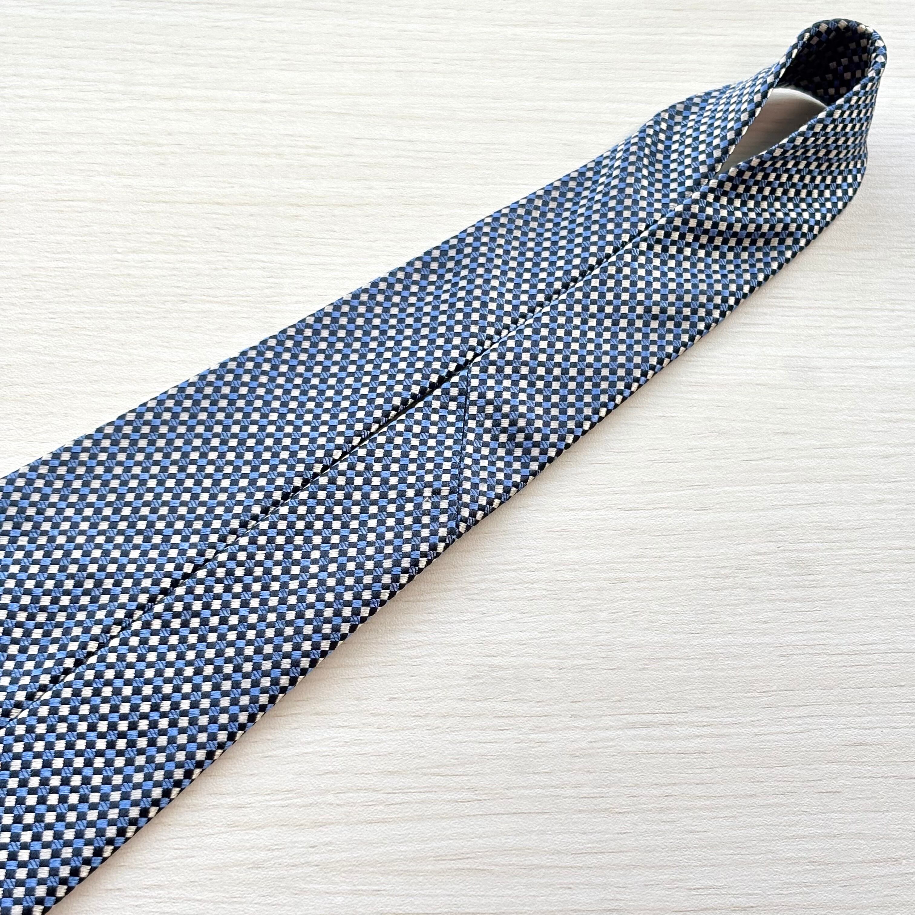 【商品概要】 Paul Stuartのスタイリッシュな中古ネクタイです。青とネイビーのチェック柄が洗練された印象を与え、ビジネスシーンやカジュアルスタイルにぴったり。100%シルク素材で、手触りが滑らかで高級感があります。