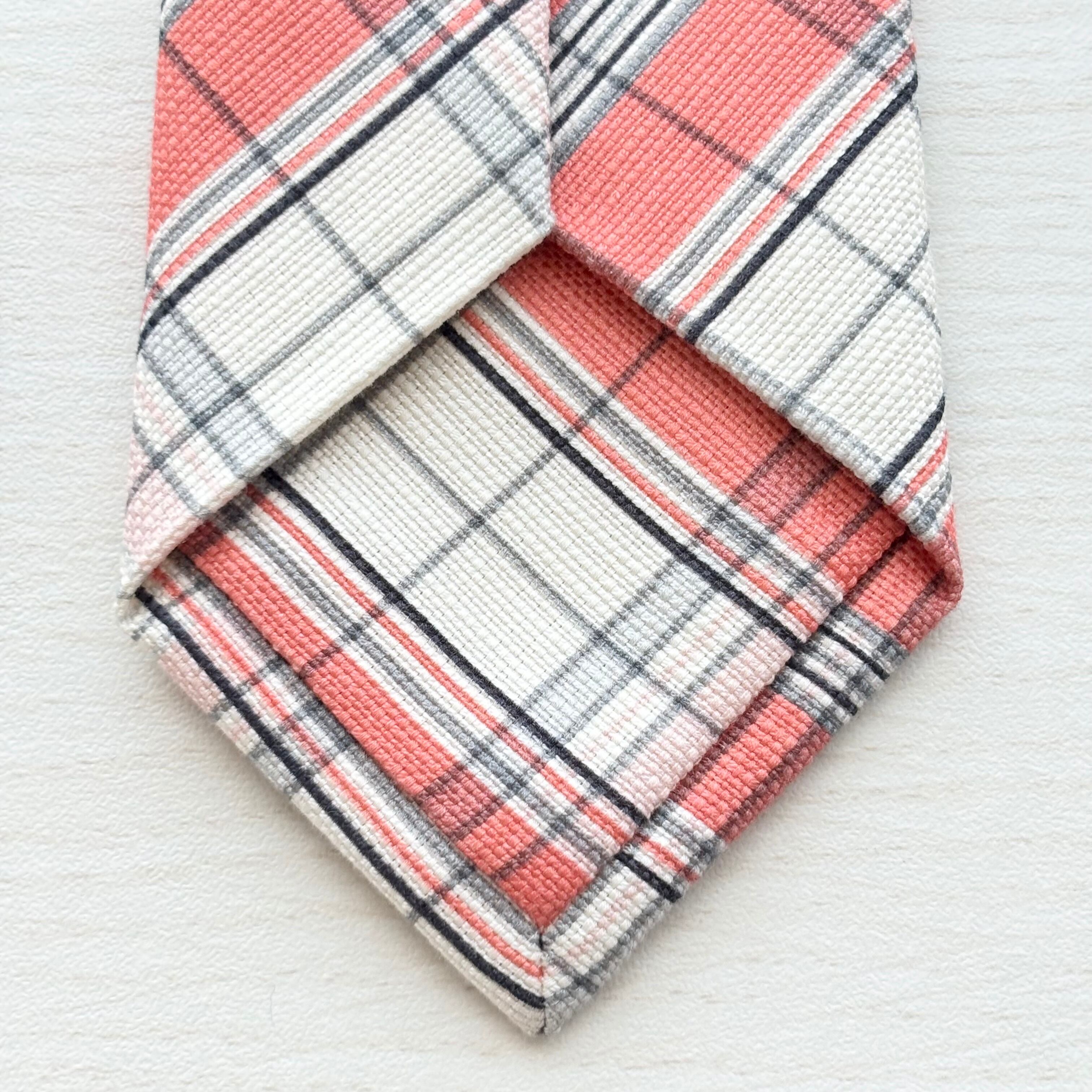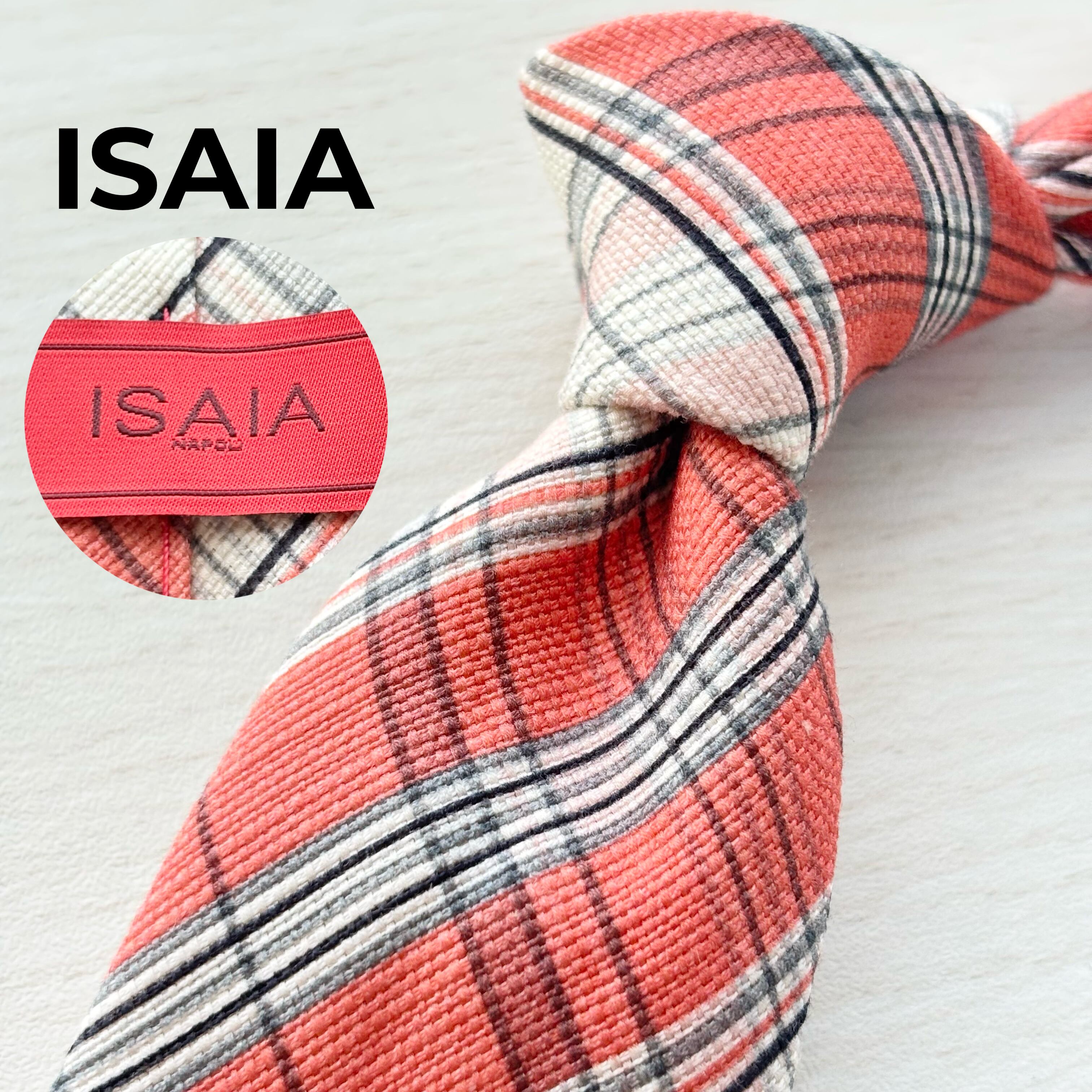 オレンジ系のチェック柄でイタリア製コットンを使った、ISAIA イザイアのネクタイ。職人による手縫いのハンドメイドが特徴。美品。