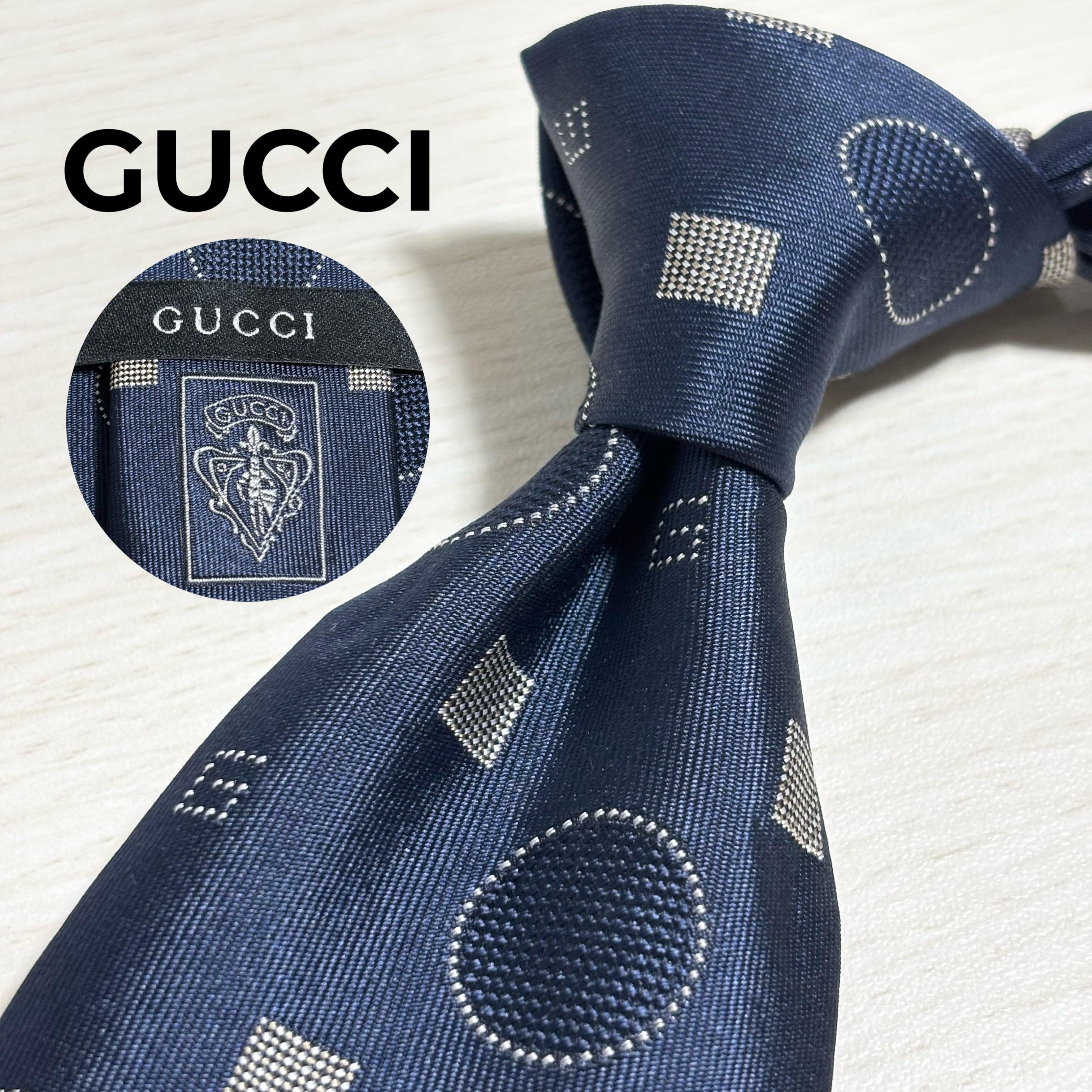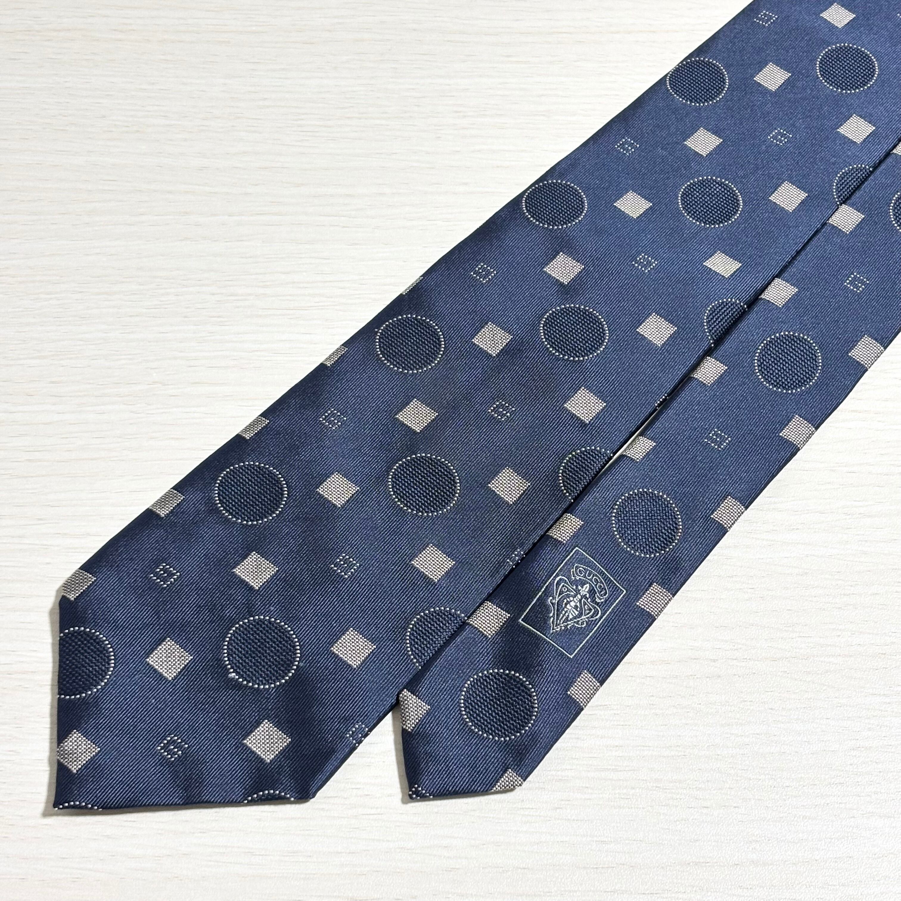 ネイビーカラーに円形と四角形のパターンが施されたGUCCIのネクタイ。